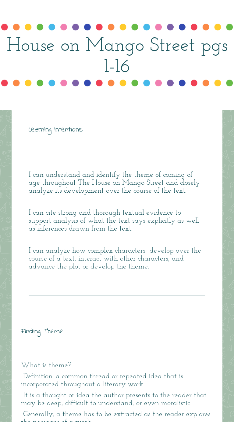 Theme Of The House On Mango Street : House On Mango Street Close Reading Cathy Queen Of Cats Teaching Resources / Throughout the house on mango street, particularly in "no speak english," those who are not able to communicate effectively (or at all) are relegated to the bottom levels of society.mamacita moves to the country to be with her husband, and she becomes a prisoner of her apartment because.. Enotes critical analyses help you gain a deeper understanding of the house on … The house on mango street is set in a latino community in chicago, and on one level it is about building a cultural identity in a society where latinos are seen as foreign. Discussion of themes and motifs in sandra cisneros' the house on mango street. Themes are the fundamental and often universal ideas explored in a literary work. Throughout the house on mango street, particularly in "no speak english," those who are not able to communicate effectively (or at all) are relegated to the bottom levels of society.mamacita moves to the country to be with her husband, and she becomes a prisoner of her apartment because.